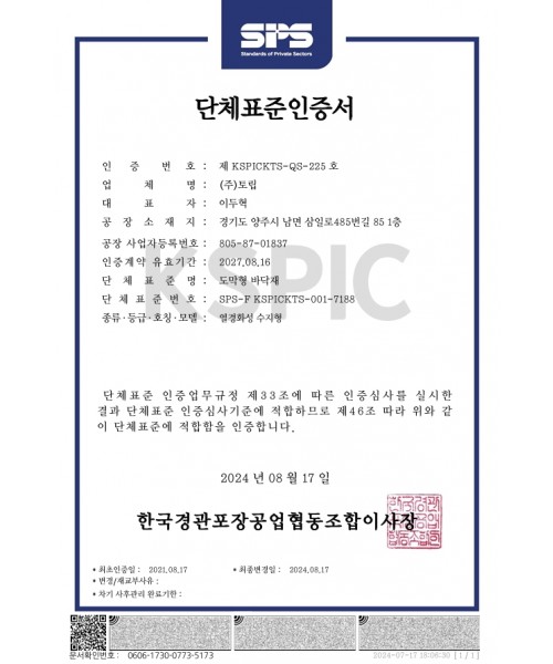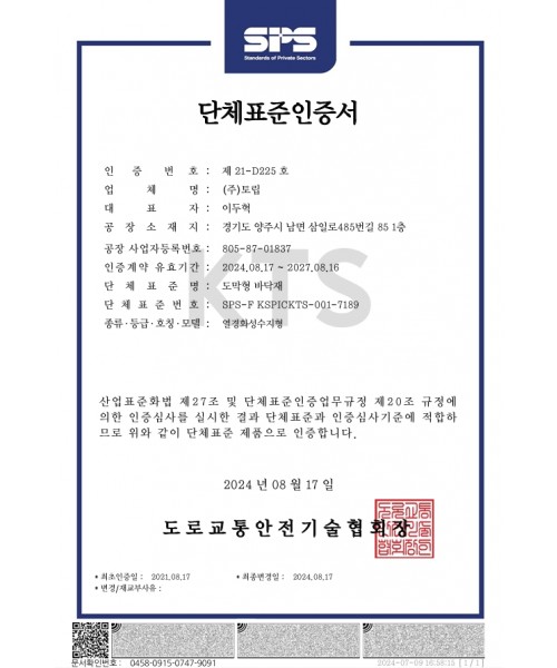 도막형 바닥재 단체표준인증서 (도로교통안전기술협회)