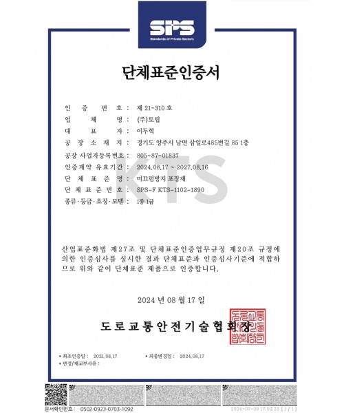 미끄럼 방지 포장재 단체표준인증서