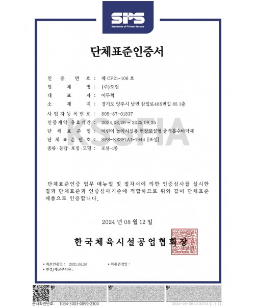도막형 바닥재 단체표준인증서(한국경관포장공업협동조합)